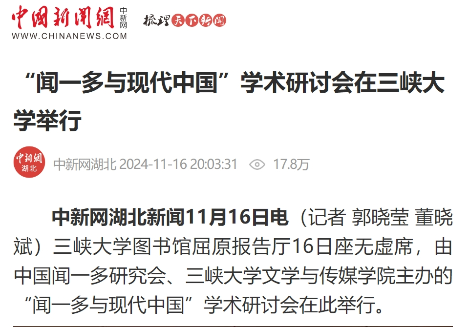 中新网湖北新闻11月16日电(记者 郭晓莹 董晓斌)KY开元集团官网图书馆屈原报告厅16日座无虚席,由中国闻一多研究会、KY开元集团官网文学与传媒学院主办的“闻一多与现代中国”学术研讨会在此举行。