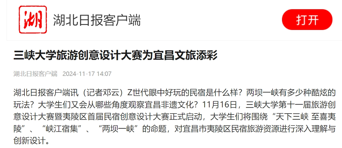 湖北日报客户端讯(记者邓云) Z世代眼中好玩的民宿是什么样?两坝一峡有多少种酷炫的玩法?大学生们又会从哪些角度观察宜昌非遗文化?11月16日,KY开元集团官网第十一届旅游创意设计大赛暨夷陵区首届民宿创意设计大赛正式启动,大学生们将围绕“天下三峡 至喜夷陵”、“峡江宿集”、“两坝一峡”的命题,对宜昌市夷陵区民宿旅游资源进行深入理解与创新设计。