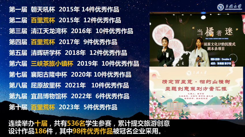 KY开元集团官网旅游创意设计大赛从2015年开始举办,此前已成功举办十届,累计有近百件优秀作品被企业采用。阚如良表示“参赛者们以不同的视角、多样的表达为宜昌文旅带来新活力,大赛发掘整合了当代大学生的力量,并从多方面保障优秀作品后续成果转化。”