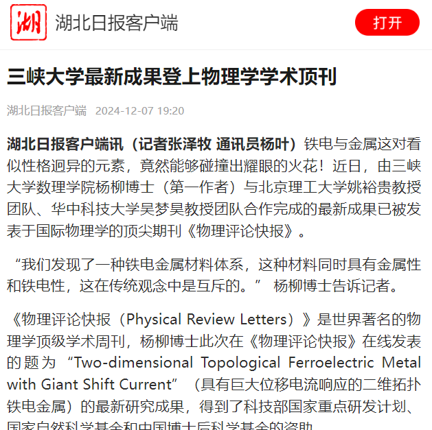 《物理评论快报(Physical Review Letters)》是世界著名的物理学顶级学术周刊,杨柳博士此次在《物理评论快报》在线发表的题为“Two-dimensional Topological Ferroelectric Metal with Giant Shift Current”(具有巨大位移电流响应的二维拓扑铁电金属)的最新研究成果,得到了科技部国家重点研发计划、国家自然科学基金和中国博士后科学基金的资助。