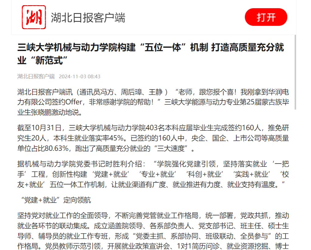 据机械与动力学院党委书记时胜利介绍:“学院强化党建引领,坚持落实就业‘一把手’工程,创新性构建‘党建+就业’‘专业+就业’‘科创+就业’‘实践+就业’‘校友+就业’五位一体工作机制,让就业渠道有广度、就业推进有力度、就业支持有温度。”