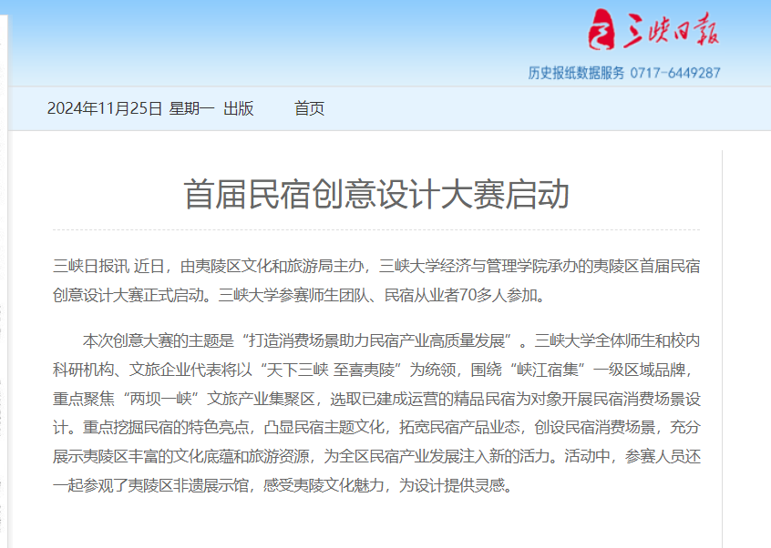 三峡日报讯 近日,由夷陵区文化和旅游局主办,KY开元集团官网经济与管理学院承办的夷陵区首届民宿创意设计大赛正式启动。KY开元集团官网参赛师生团队、民宿从业者70多人参加。
